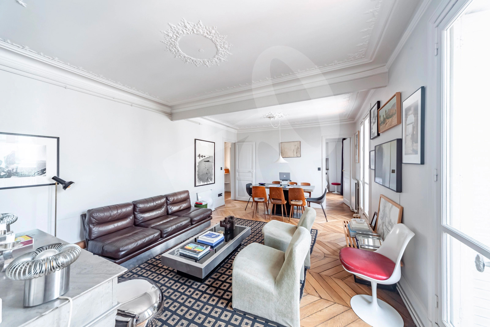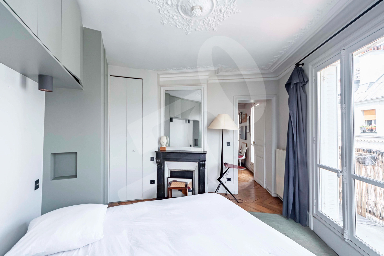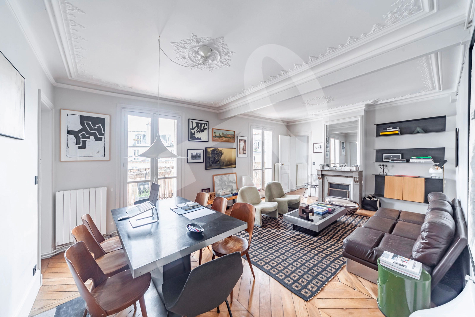 Le séjour double, baigné de lumière grâce à une exposition sud-ouest, révèle parquet point de Hongrie, moulures d'époque, cheminée en marbre et une belle hauteur sous plafond d'environ 2,85 m. L'ensemble ouvre sur un balcon filant de près de 10 m², offrant une vue dégagée sur les toits de Montmartre et jusqu'à la Tour Eiffel.